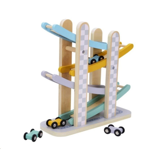 Závodná dráha so 4 závodnými autíčkami pre deti, vyrobená z prírodného dreva, v jemných pastelových farbách, je zábavnou hračkou pre chlapcov, dievčatá aj celú rodinu. Stačí správne položiť jedno zo závodných autíčok na začiatok závodnej dráhy (na najvyššie patro autodráhy) a potom sledovať, s akou úžasnou rýchlosťou prekoná všetky nižšie patra, až dorazí do úplného cieľa. Pri hre s autodráhou si deti precvičia jemnú motoriku, koordináciu očí a rúk, sústredenie, trpezlivosť a prebúdzajú v sebe prirodzenú súťaživosť. Zorganizujte u vás doma preteky, pri ktorých si užijete veľa zábavy. Zo závodných autíčok v krásnych farbách si svojho favorita vyberie každý, stačí vziať stopky do ruky a preteky môžu začať.