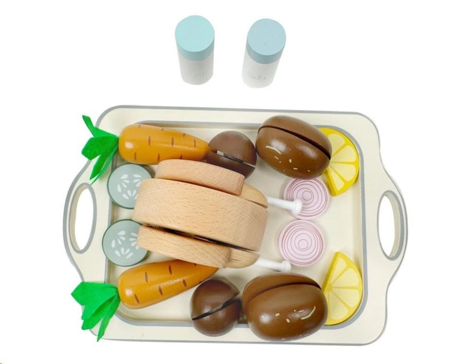 Drevená sada potravín so zeleninou, kurčaťom, solničkou, korením a veľkým podnosom (táckom) je skvelým doplnkom do detskej kuchynky. S touto sadou bude príprava (pečenie) kurčaťa hračkou a veľkou zábavou. Drevené kurča stačí obložiť obľúbenou zeleninou a prílohami, osoliť, okoreniť a vložiť do rúry, ktorá je súčasťou detskej kuchynky vašej dievčatko alebo chlapca. Teraz už len pohlídať, aby sa kurča nespálilo a chutné vyzerajúce jedlo je pripravené na podávanie. S touto originálnou sadou drevených potravín si deti vyskúšajú prípravu obeda bezpečným detským spôsobom, zdokonalia motorické zručnosti a manuálnu zručnosť, pustia uzdu svojej fantázii, pridajú sa do roly kuchára, mamičky, otecka a užijú si veľa zábavy. Na natieranie sa používajú vodou riediteľné farby, vhodné a bezpečné pre deti.