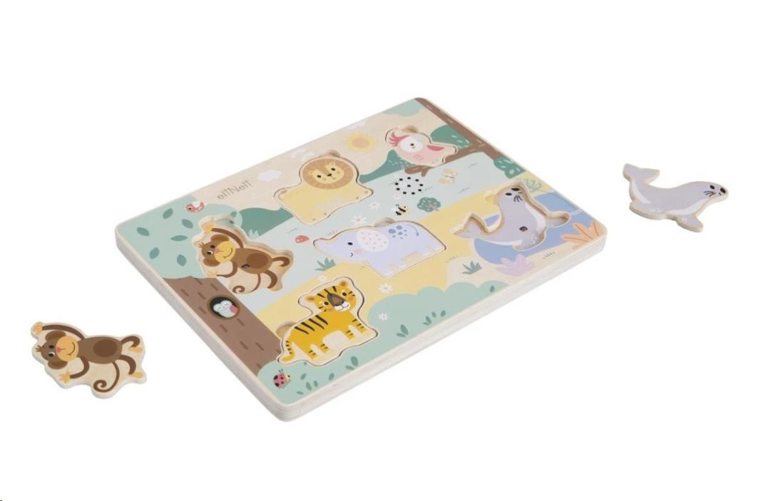 Zvukové vkladacie puzzle s obľúbenými zvieratami - levom, tigrom, slonmi, lachtanom, opičkou a papagájom, zavedie deti do ZOO. S drevenými puzzle dielikmi v podobe zvierat deti potrénujú motorické zručnosti, koordináciu očí, logické myslenie, stimulujú zmysly, naučia sa trpezlivosti, sústrediť sa a ešte si užijú veľa zábavy.