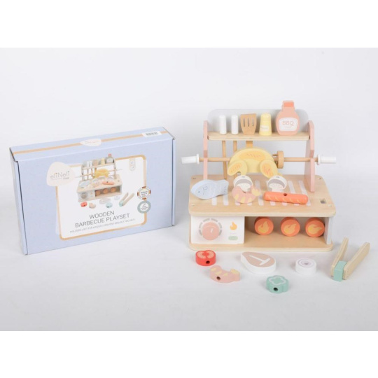 Drevený gril s bohatým príslušenstvom umožní deťom vyskúšať si grilovanie bezpečným detským spôsobom. Usporiadať Barbecue slávnosť bude hračka a veľká zábava. Žiadne letné grilovanie sa neobíde bez rôznych druhov mäsa, zeleniny a omáčok, to všetko v BBQ sade nájdete, vrátane ďalších doplnkov pre prípravu mäsa a špízu. Komponenty s detskou BBQ sadou môžete grilovať celý rok, kdekoľvek a za akéhokoľvek počasia.