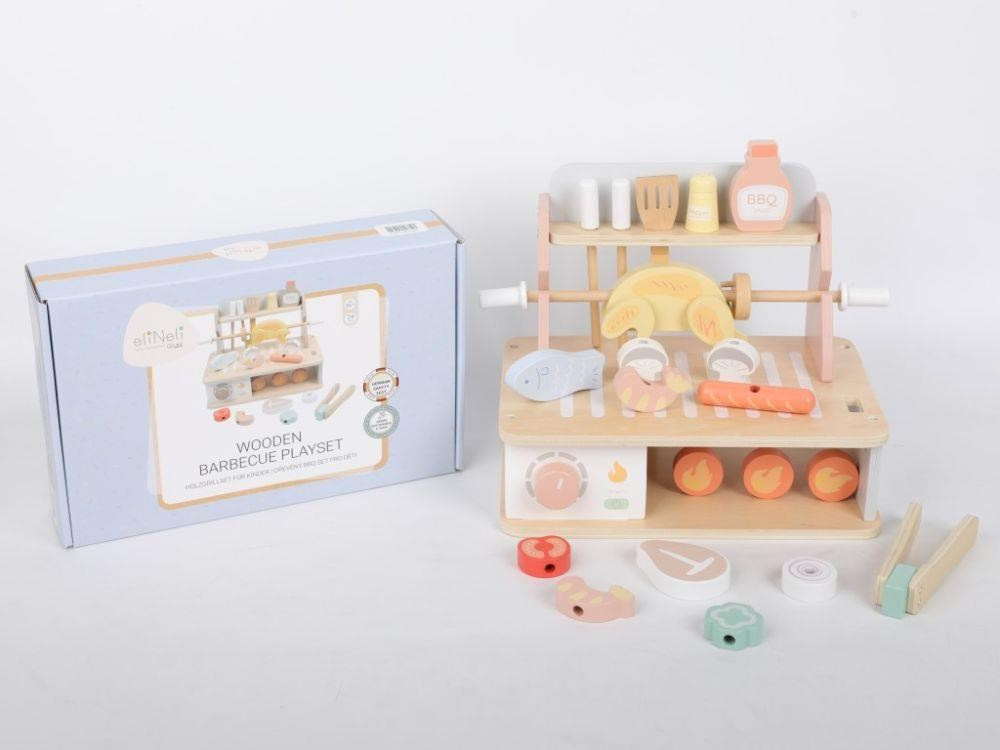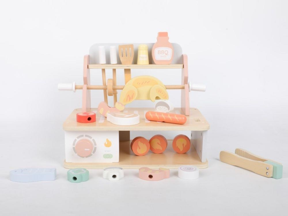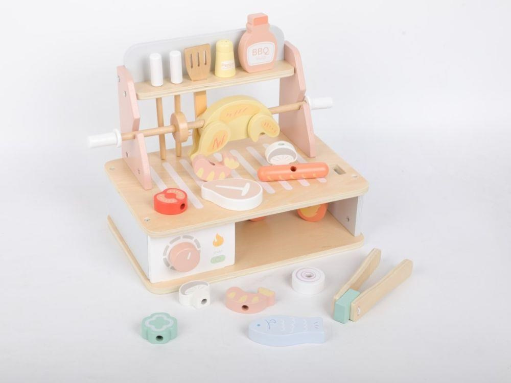 Drevený gril s bohatým príslušenstvom umožní deťom vyskúšať si grilovanie bezpečným detským spôsobom. Usporiadať Barbecue slávnosť bude hračka a veľká zábava. Žiadne letné grilovanie sa neobíde bez rôznych druhov mäsa, zeleniny a omáčok, to všetko v BBQ sade nájdete, vrátane ďalších doplnkov pre prípravu mäsa a špízu. Komponenty s detskou BBQ sadou môžete grilovať celý rok, kdekoľvek a za akéhokoľvek počasia.
