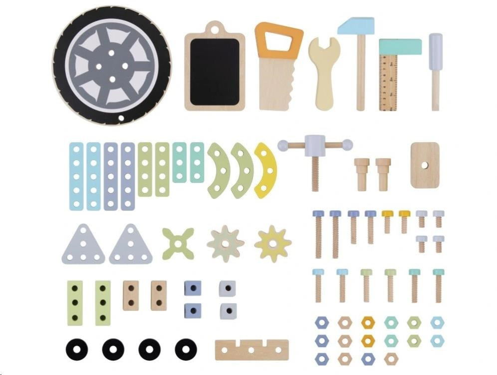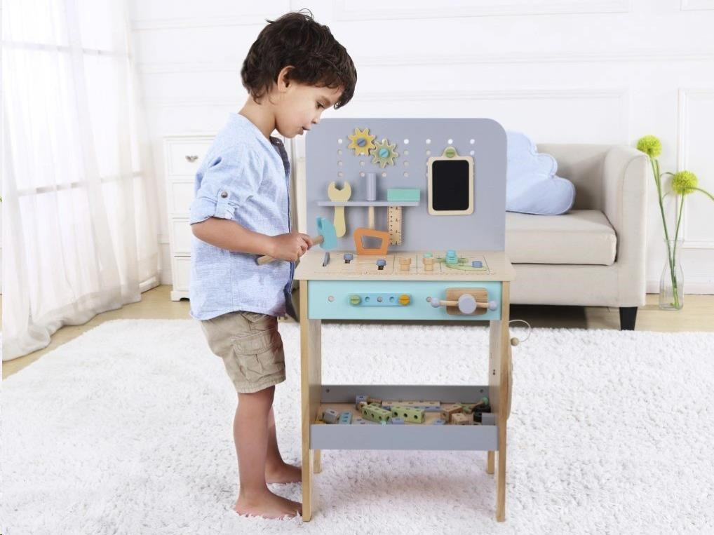 Detský drevený ponk v jemných pastelových farbách nadchne deti aj dospelých svojím nadštandardným vybavením. Okrem klasického kutilského náradia je jeho súčasťou aj kotúčová píla, zváračka a dokonca kompresor. Bohaté príslušenstvo a rôzne vychytávky sú zárukou zábavnej hry na majstra, ktorá u detí zdokonalí ich zručnosti a naučí ich novým.