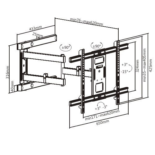 Držiak LCD LED TV Fiber Mounts TALL1 Vynikajúci nástenný držiak na TV 37-80", otočný, sklopný, výsuvný, VESA štandardy 200x100 až 600x400, nosnosť 50kg Kvalitný nástenný držiak na LCD, LED a plazmové televízie s uhlopriečkou 37-80". Držiak má kvalitnú konštrukciu, ktorá unesie televíziu s hmotnosťou až 50kg, spoľahlivá a bezpečná inštalácia na stenu zaručujú dlhšie nástenné lišty, vďaka ktorým sa celková hmotnosť rozloží na veľkú plochu. Podporuje VESA štandardy pre zavesenie TV s roztečou 200x100 až 600x400. Držiak TALL1 umožňuje televízii otáčať do strán, naklápať, vysúvať a prišovať ku stene, ľahko upraviť rovinu obrazu. Farebné prevedenie čierne. Záruka 5 rokov. Kvalitný držiak TV 37-80", otočný, sklopný a výsuvný - Fiber Mounts TALL1 Technické údaje: nosnosť 50 kg vhodný na televízie s uhlopriečkou 37-80" podporuje VESA štandardy 200x100 až 600x400 výsuvný od steny v rozmedzí 76 - 620 mm otáčanie do strán +/- 90° naklonenie TV +3° až -15° korekcia roviny +/- 3° kvalitná konštrukcia prodlúžené nástenné lišty pre bezpečné ukotvenie a perfektné rozloženie hmotnosti veľmi jednoduchá inštalácia vďaka šablóne na predvŕtanie otvorov do steny farebné prevedenie čierne záruka 5 rokov Výsuvný držiak TV 37-80", otáčanie TV do strán, naklápanie TV - Fiber Mounts TALL1 Nástenný držiak na TV Fiber Mounts TALL1 podporuje VESA štandardy: VESA 200x100 VESA 200x200 VESA 300x200 a 200x300 VESA 300x300 VESA 400x200 a 200x400 VESA 400x300 a 300x400 VESA 400x400 VESA 600x400 Držiak TV Fiber Mounts TALL1 je vhodný na všetky televízie, ktoré podporujú ktorýkoľvek z vyššie uvedených VESA štandardov a ich hmotnosť nie je vyššia ako 50kg. Nástenné lišty o dĺžke 423mm zabezpečia spoľahlivé a bezpečné ukotvenie držiaku do stien. Každá lišta má 3 kotviace otvory. Vďaka tomu sa celková hmotnosť výborne rozloží na veľkú plochu a je zaručená vyššia bezpečnosť. Držiak je vhodný na inštaláciu na klasické tehličkové, betónové a drevené steny, ale aj siporexové alebo z dutých tehál (v týchto prípadoch je nutné zakúpiť k tomu určené hmoždinky). Inštalácia na sadrokartónové steny je možná iba v prípade ukotvenia do nosníkov alebo výdrevy, samotný sadrokartón na inštaláciu nie je vhodný.