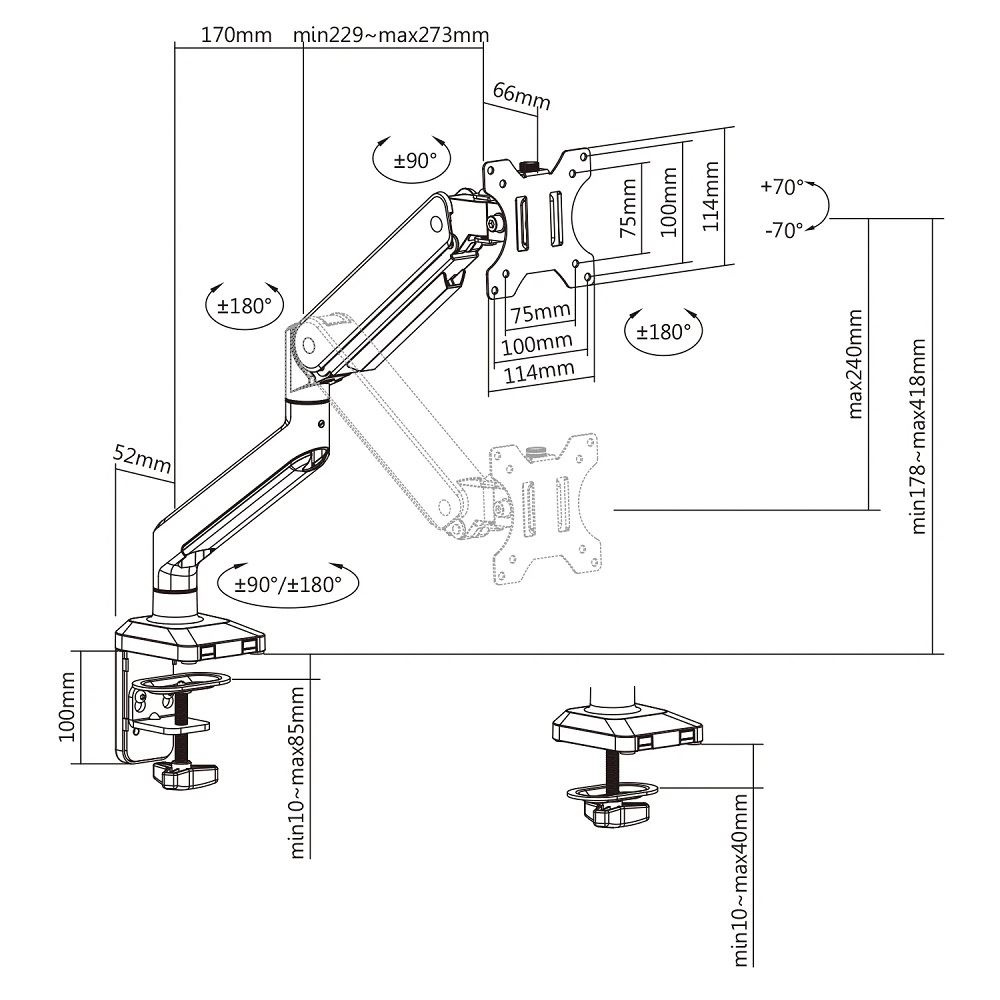 Profesionálny stolný držiak na monitor TV All in One 15-35", otočný +/- 180°, sklopný +/- 45°, nastaviteľná výška 178-418mm, výškové polohovanie 240mm, dĺžka max. 443mm, 2 typy úchytov na stôl, VESA 75x75 a 100x100, nosnosť 15kg