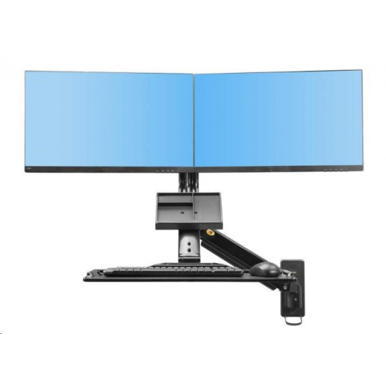 Držiak na 2 monitorov a klávesnicu Fiber Mounts MC27-2AB Profesionálna nástenná pracovná stanica na 2 monitory 17-27" a klávesnicu s myšou Pracovná stanica s nástenným držiakom na 2 monitory (ukotvenie vedľa seba) s policou na klávesnicu a myš. Kompletné nastavenie pozícií monitorov aj police, plná polohovateľnosť - otáčanie, naklápanie, výškové polohovanie, odsadenie od steny. Inštalácia na zvislé povrchy (stena, priečka, stĺpik, pilier, stroje atď.). Najvyššia kvalita, krásny dizajn, ľahká ovládateľnosť - profesionálny výrobok. Farba čierna, záruka 3 roky. Nástenná pracovná stanica s držiakom na 2 monitory a policou na klávesnicu a myš, výškové polohovanie pre prácu v sede i v stoji, otáčanie naklápanie - Fiber Mounts MC27-2AB Technické údaje: minimálne zaťaženie 6kg (kvôli tuhosti plynového piestu) maximálne zaťaženie 12kg ideálny na monitory s uhlopriečkou 17" až 27" nastavenie požadovanej pozície monitorov naklápanie +10° až -15° výškové polohovanie od police 100mm funkcia pivot maximálna vzdialenosť medzi držiakmi monitorov 670mm polohovanie ramena držiaka otáčanie do strán +180°/-180° výškové polohovanie 480mm nastavenie vzdialenosti od steny 90mm (zaklopená polička) až 1010mm polica na klávesnicu s myšou rozmery 560mm x 200mm nastavenie náklonu police +12°/-12° úprava vzdialenosti police od monitorov až 60mm možnosť zaklopenia police na klávesnicu a myš priehradka na dokumenty, poznámky, vizitky, zápisník atď. systém vedenia káblov profesionálne spracovanie, najvyššia kvalita farebné prevedenie čierne záruka 3 roky
