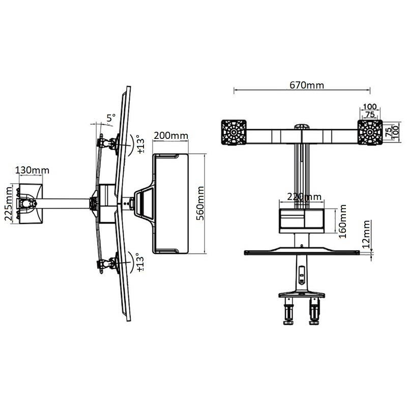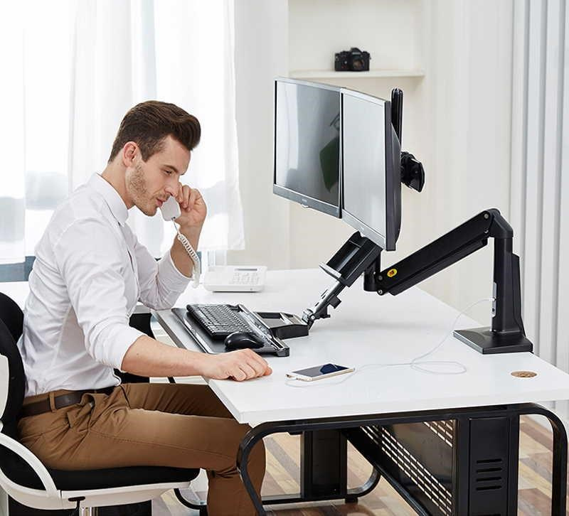 Profesionálny stolový držiak na 2 monitory 17-27" s policou na klávesnicu a myš, ergonomický pre prácu vo vzpriamene alebo vsed E s jednoduchým a rýchlym výškovým polohovaním 480 mm. Monitory je možné na držiaku posúvať do strán, naklápať, otočiť na šírku alebo na výšku, mierne natáčať do strán, výškovo polohovať. Extrémne jednoduché výškové polohovanie celého držiaku vďaka plynové pružine, počas okamihu môžete zmeniť pozíciu vsed E na pozíciu vstoje a otočiť držiak do strán +/- 180°. Profesionálna kvalita s dôrazom na dizajn, 2x USB porty 3.0, systém pre vedenie káblov, jednoduchá inštalácia na stolové dosky o priemere 10-95mm. Farebné prevedenie čierne, záruka 3 roky.