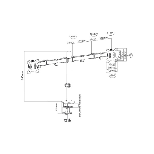 Držiak na 2 monitory Fiber Mounts M8C84 Držiak s uchytením na okraj stola na 2 monitory 15-30", nastaviteľná pozícia monitorov, kvalitná konštrukcia, VESA štandardy 75x75 a 100x100, nosnosť 16kg Držiak na zavešenie 2 monitorov a uchytenie na okraj stola. Jednoduchá inštalácia a nastavovanie monitorov do požadovaných pozícií. Držiak podporuje VESA štandardy 75x75 a 100x100 a zaviesť môžete monitory s celkovou hmotnosťou až 16kg. Držiak má kvalitnú konštrukciu, zavešenie monitorov je úplne spoľahlivé a bezpečné. Dodávame vrátane inštalačného materiálu. Záruka 5 rokov. Stolný držiak na 2 monitory Fiber Mounts M8C84 Technické údaje: nosnosť 16kg (2 x 8kg) na monitory s uhlopriečkou 15-30" podpora VESA štandardov 75x75 a 100x100 dĺžka stolovej tyče 390mm nastaviteľná výška ramien otáčanie do strán +/- 180° nasklopenie +/- 45° maximálna dĺžka ramien 397mm uchytenie na okraj stola, hrúbka stolovej dosky 10-88mm robustná kovová konštrukcia jednoduchá inštalácia, pevné a bezpečné zavešenie monitorov úchytky na káble inštalačný materiál farebné prevedenie čierne záruka 5 rokov Držiak na 2 monitory s uchytením na stôl Fiber Mounts M8C84 Držiak M8C84 podporuje VESA štandardy: VESA 75x75 VESA 100x100 Držiak je vhodný na monitory a displeje s uhlopriečkou 15-30", uchytenie držiaka je možné na stolové dosky hrúbky 10-88mm. Maximálna možné celkové zaťaženie je 16kg, 2 monitory po 8kg.