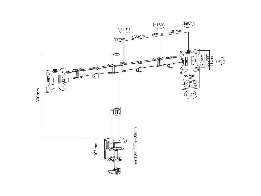 Držiak na 2 monitory Fiber Mounts M8C84 Držiak s uchytením na okraj stola na 2 monitory 15-30", nastaviteľná pozícia monitorov, kvalitná konštrukcia, VESA štandardy 75x75 a 100x100, nosnosť 16kg Držiak na zavešenie 2 monitorov a uchytenie na okraj stola. Jednoduchá inštalácia a nastavovanie monitorov do požadovaných pozícií. Držiak podporuje VESA štandardy 75x75 a 100x100 a zaviesť môžete monitory s celkovou hmotnosťou až 16kg. Držiak má kvalitnú konštrukciu, zavešenie monitorov je úplne spoľahlivé a bezpečné. Dodávame vrátane inštalačného materiálu. Záruka 5 rokov. Stolný držiak na 2 monitory Fiber Mounts M8C84 Technické údaje: nosnosť 16kg (2 x 8kg) na monitory s uhlopriečkou 15-30" podpora VESA štandardov 75x75 a 100x100 dĺžka stolovej tyče 390mm nastaviteľná výška ramien otáčanie do strán +/- 180° nasklopenie +/- 45° maximálna dĺžka ramien 397mm uchytenie na okraj stola, hrúbka stolovej dosky 10-88mm robustná kovová konštrukcia jednoduchá inštalácia, pevné a bezpečné zavešenie monitorov úchytky na káble inštalačný materiál farebné prevedenie čierne záruka 5 rokov Držiak na 2 monitory s uchytením na stôl Fiber Mounts M8C84 Držiak M8C84 podporuje VESA štandardy: VESA 75x75 VESA 100x100 Držiak je vhodný na monitory a displeje s uhlopriečkou 15-30", uchytenie držiaka je možné na stolové dosky hrúbky 10-88mm. Maximálna možné celkové zaťaženie je 16kg, 2 monitory po 8kg.