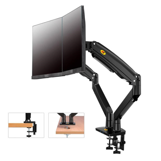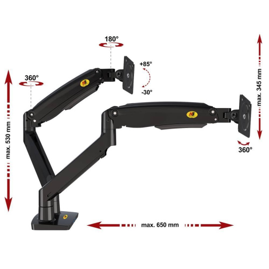 Dvojmonitorový stolný držiak NB F195AB Profesionálny stolný držiak na 2 monitory 19-37", 3D nezávislé nastavenie polohy, design, kvalita, ergonómia, VESA 75x75 a 100x100, nosnosť 18kg Špičkový profesionálny stolný držiak na zavesenie 2 monitorov a ich nezávislé nastavenie polohy: otáčanie do strán, nastavenie výšky, nastavenie vzdialenosti od stolového držiaku, náklon, rotácia obrazovky. korekcia roviny. Hmotnosť každého monitoru musí byť v rozmedzí 3-9kg. Balenie obsahuje 2 typy úchytov na stolovú dosku, inštalačný materiál a návod. Farebné prevedenie čierne. Záruka 3 roky. Stolný držiak na 2 monitory 19-37" do kancelárie alebo pracovne NB F195AB Technické údaje: celková nosnosť 18kg hmotnosť každého monitora musí byť v rozmedzí 3 ÷ 9 kg podpora VESA štandardu 75x75 a 100x100 v prípade potreby za príplatok možnosť rozšírenia VESA na 200x100 alebo 200x200 odporúčaná uhlopriečka monitorov 19" až 37" nezávislé nastavenie výšky: min. 220mm, max. 565mm nezávislé otáčanie monitoru do strán +/- 180° nezávislé naklonenie monitoru +53° až -8° nezávislá rotácia monitoru - otočenie monitora na šírku alebo na výšku, korekcia roviny nezávislé nastavenie vzdialenosti od stolového držiaka: 0mm až 700mm ukotvenie na stolové dosky o priemere 10mm až 90mm balenie obsahuje 2 typy úchytov na stolové dosky (svorky na okraj stolu + skrutkovanie do priestoru stola) 2x USB port vynikajúca kvalita, krásny design ľahké nastavenie polohy monitorov spoľahlivosť, bezpečnosť farebné prevedenie čierne, strieborné alebo biele záruka 3 roky Polohovateľný stolný držiak 2 monitorov do kancelárií a pracovní NB F195AB Dvojmonitorový stolný držiak podporuje VESA štandardy: VESA 75x75 VESA 100x100 za príplatok rozšírenie na VESA 200x100 za príplatok rozšírenie na VESA 200x200