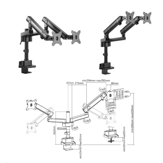 Profesionálny stolný držiak na 3 monitory Fiber Mounts M8C11 Plne nastaviteľný kancelársky držiak na zavesenie troch monitorov 15-29", profesionálne prevedenie, VESA 75x75 a 100x100, nosnosť 21kg Profesionálny systém na upevnenie a plnohodnotné polohovanie troch monitorov - otáčanie do strán, náklon, dĺžkové nastavovanie, rotácia obrazoviek. Držiak podporuje VESA štandardy 75x75 a 100x100. Maximálna hmotnosť monitora 7kg (celkovo 21kg). Držiak splní požiadavky každého používateľa. Profesionálny stolný držiak do kancelárie na 3 monitory Fiber Mounts M8C11 Technické údaje: celková nosnosť 21kg (3 x 7kg) podpora VESA štandardu 75x75 a 100x100 odporúčaná uhlopriečka monitorov 15" až 29" výškové polohovanie každého ramena 225mm až 575mm rotácia obrazoviek - možnosť nezávislého otočenia každého monitoru na šírku alebo na výšku nastavenie vzdialenosti krajného monitoru možnosť nastavenia monitorov do priečky alebo do paraboly upevnenie na stolovej doske o priemere 10mm až 50mm stolový úchyt má integrované pripojenia USB 3.0 systém vedenia káblov materiál hliník a oceľ farebné prevedenie čierne záruka 5 rokov Stolný držiak na 3 monitory Fiber Mounts M8C11 Držiak na 3 monitory M8C11 podporuje VESA štandardy: VESA 75x75 VESA 100x100 Profesionálny držiak na tri monitory s plnohodnotným polohovaním. Držiak je vhodný do kancelárií, pracovní, firemných aj domových kancelárií.