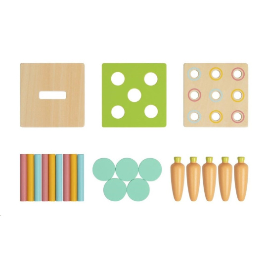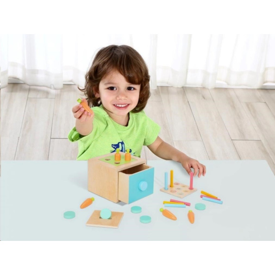 Drevená edukačná hračka (box), pre deti od 1 roka, predstavuje hneď 3 hračky v jednom. Multifunkčná bednička (box) s vymeniteľnou hornou časťou je zábavnou vkladačkou s mrkvičkami, s farebnými valčekmi alebo pokladničkou. Vďaka 3 vymeniteľným doskám môžu deti hrať rôzne hry, zdokonaľovať svoje zručnosti a užívať si veľa zábavy.