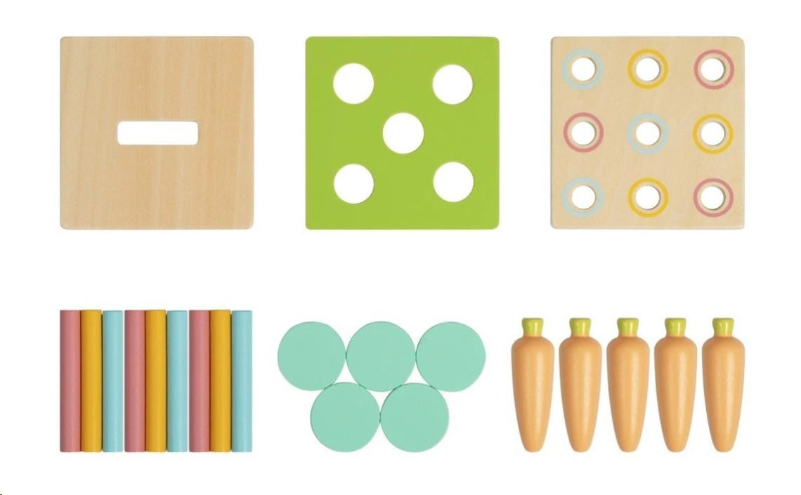 Upozornenie: Balenie obsahuje celkom 24 dielov (1 box, 1 šuplík, 3 vymeniteľné dosky, 9 farebných valčekov, 5 žetónov, 5 mrkvičiek), nie 26, ako je uvedené na obale.