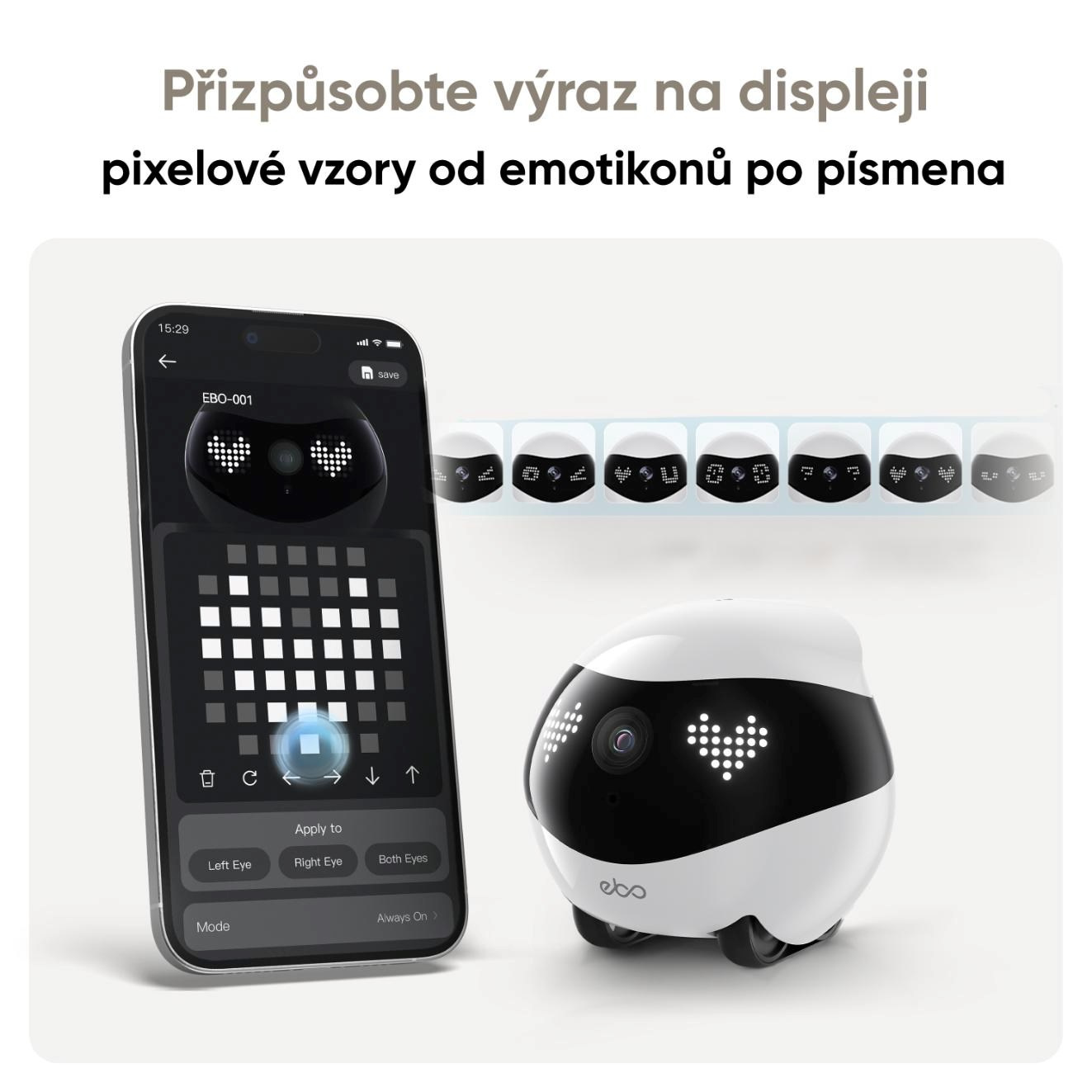 • Pixelové oči s animáciami – štýlový pixelový displej nahrádza oči a dodáva robotovi priateľský, hravý výraz.