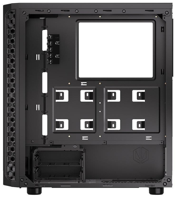 Skriňa formátu Middle Tower s priehľadnou bočnicou z tvrdeného skla ponúka dve 2,5" pozície pre SSD disky a dve 3,5" pozície pre pevné disky. Na hornej časti sa nachádza dva USB 3.0 porty, slúchadlový výstup a audio vstup pre mikrofón. Vybavená je štyrmi 120 mm ventilátormi, ktoré spolu s perforovaným predným panelom zabezpečujú dostatočné prúdenie vzduchu. Dômyselné riešenie umožňuje pohodlné umiestnenie až 360 mm dlhého výmenuňíka vodného chladenia na prednej strane. Vo skrini je dostatok priestoru pre chladicu CPU do výšky až 161 mm a grafickú kartu dĺžky až 350 mm. Dodáva sa bez zdroja. Súčasťou je tiež sada prachových filtrov.