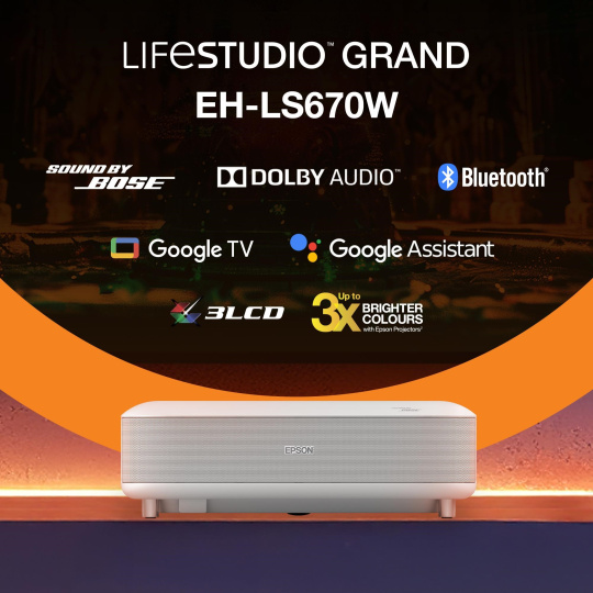 Epson Lifestudio Grand – EH-LS670W diamantová biela, 4K PRO-UHD, 3600lm, HDMI, USB, Google TV, 240Hz