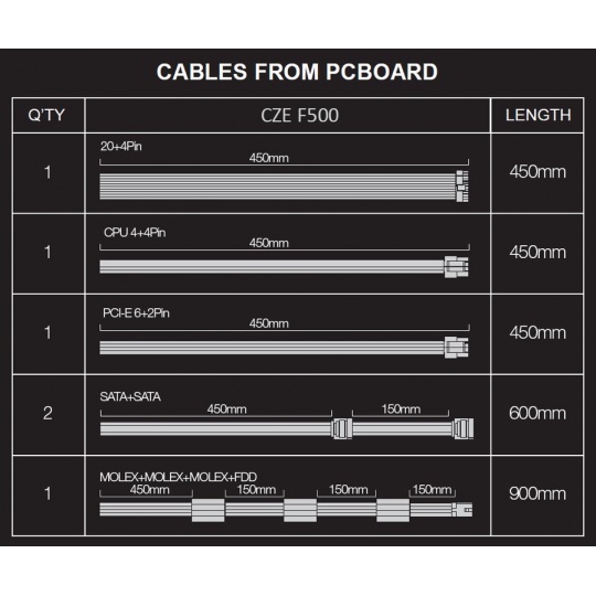 - 1x MOLEX, 450mm + MOLEX 150mm + MOLEX 150mm + FDD 150 mm