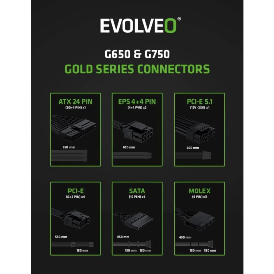 Zabudnite na zamotané káble, ktoré bránia prúdeniu vzduchu a ešte kazia štýl vášho počítača. Zdroj EVOLVEO G650-BK je plne modulárny, takže k nemu pripojíte len tie káble, ktoré naozaj potrebujete. Súčasťou balenia sú všetky dôležité šnúry – jeden kábel ATX 24 PIN, dva EPS 4+4 PIN, dva PCI-E 6+2 PIN, jeden PCI-E 5.1 12V-2×6, tri SATA a jeden MOLEX. Vďaka tomu máte miesto na všetko od CPU a GPU cez disky až po vymazlené LED pásky či iné špeciálne prvky.