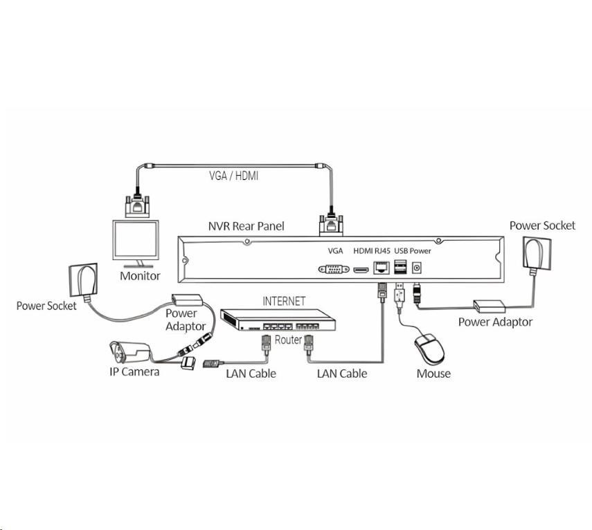 | Obsah balenia | NVR jednotka s 8 kanálmi, SATA pripojením pre až 8TB disk 4x IP Bullet IP66 kamera s nočným prísvitom 1x napájací adaptér DC 12V 2A pre NVR 4x napájací adaptér DC 12V 1A pre kamery 4x sada na upevnenie kamery 4x bajonetová tesniaca krytka pre RJ45 konektor 1xUSB myš 1x SATA kábel pre pripojenie HDD 1x Používateľský manuál |