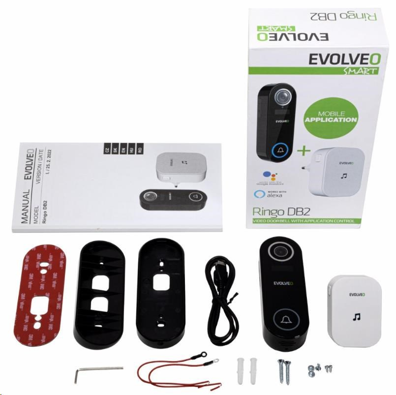 | Obsah balenia | EVOLVEO Ringo DB2, chytrý videozvonoček Zvonček do zásuvky Používateľský návod Plochá montážna konzola Uhlová montážna konzola 3M samolepiaca montážna nálepka Nabíjací káb?l USB Malý imbusový kľúč Bezpečnostný skrutka 2x montážne skrutky + hmoždinky 2x montážne skrutky pre uhlovú konzolu 2x pripojovacie vodiče pre pevnú kabeláž 2x skrutky na pripojenie vodičov |
