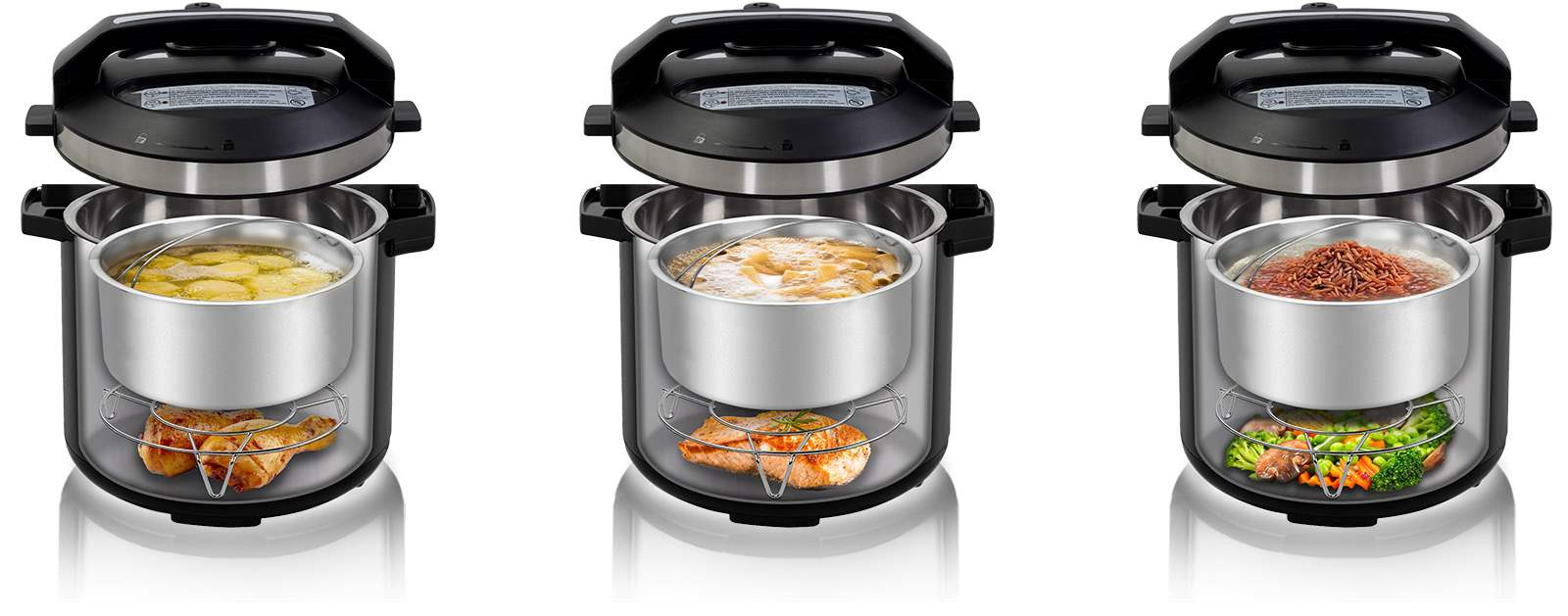 S nerezovou nádobou na prílohy, ktorá je súčasťou balenia, uvaríte tlakovým varením hlavný chod a prílohu oddelene, ale naraz v jednom hrnci! Jedlo je za pár minút hotové :-) Na varenie prílohy súčasne s hlavným chodom je potrebné voliť skladbu jedla tak, aby doba varenia hlavného chodu aj prílohy v tlaku bola pre obe časti jedla ideálna. Je vhodné napríklad použiť na varenie ako prílohu červenú ryžu natural, ktorá sa pripravuje v tlaku 30 minút,
