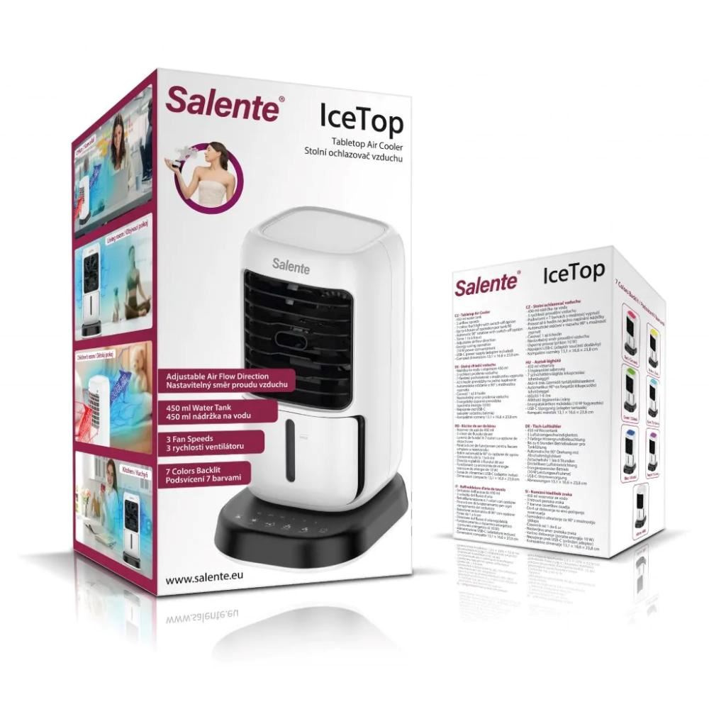Multifunkčné zariadenie Salente IceTop plní funkciu malého stolného ochladzovača vzduchu, ktorý vám v horúcich letných dňoch alebo teplých priestoroch bez možnosti klimatizácie spríjemní prácu aj súkromie. Súčasne plní funkciu zvlhčovača a nedochádza tak pri jeho prevádzke k vysušovaniu vzduchu ako je tomu u štandardných klimatizácií. Pri prevádzke bez naplnené vodnej nádržky plní funkciu klasického stolného letného ventilátora. Na jedno naplnenie vodnej nádržky vydrží v prevádzke 6 hodín.