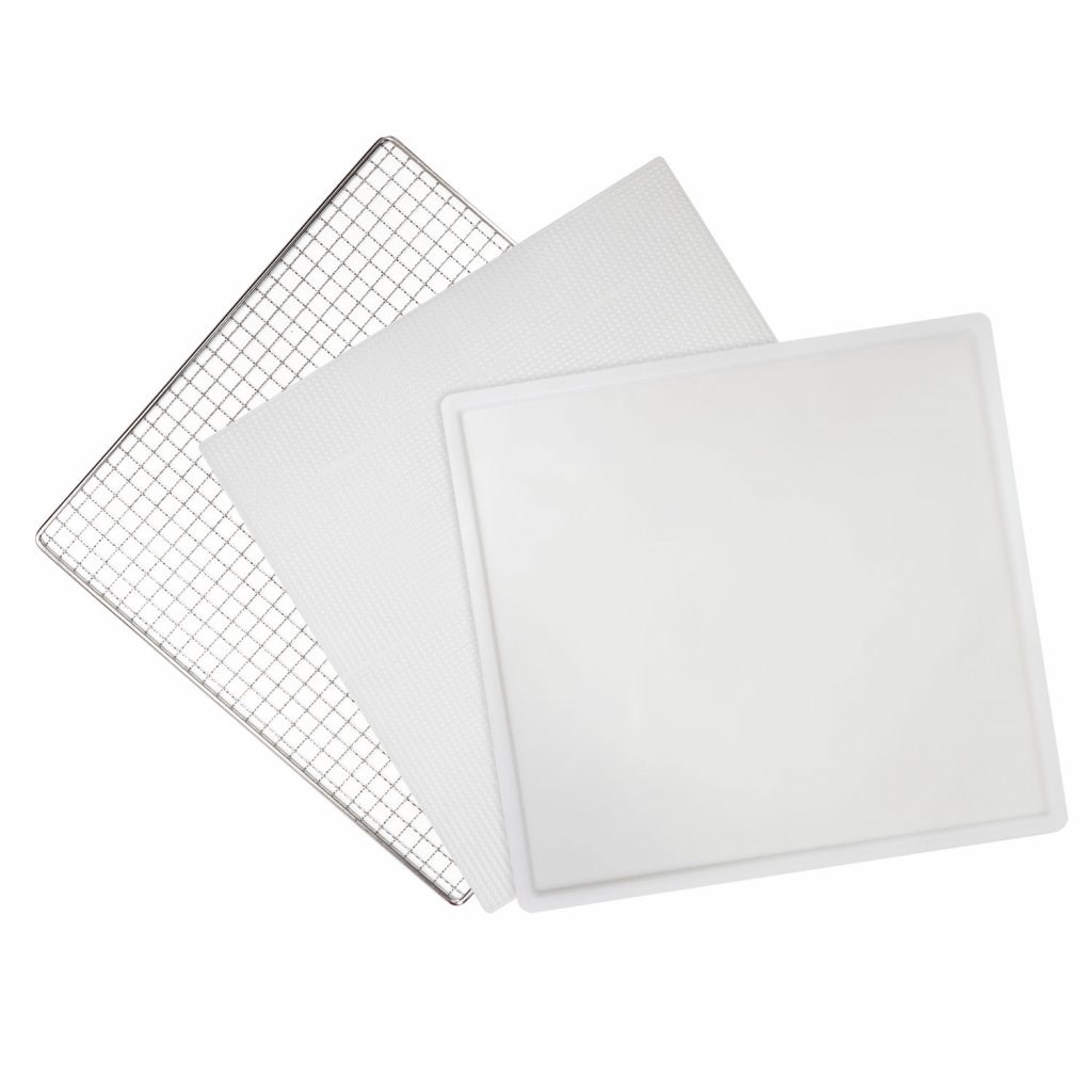 • 10 vložiek na platne s jemnou sieťkou na sušenie jemnejších a lepkavých surovín (napr. húb, byliniek, banánov, rajčiat atď.)