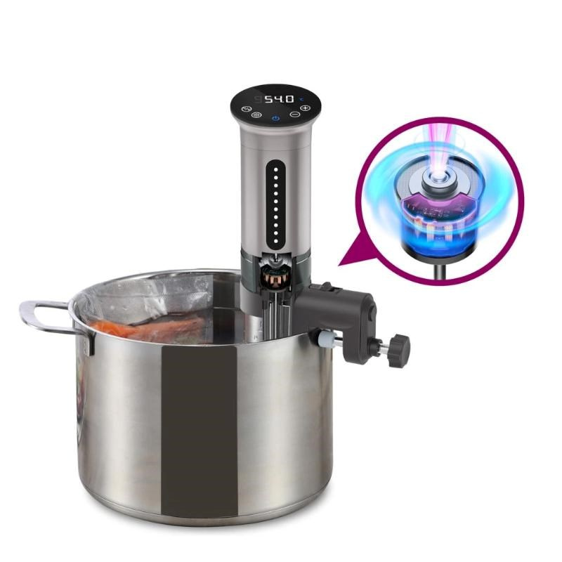 Rovnomerné zohrievanie kúpeľa na nastavenú teplotu zabezpečuje špičkový DC motor. Prítok dosahuje hodnoty 20 litrov za minútu, čo je dvojnásobne viac v porovnaní s konkurenciou. Ďalšou výhodou DC motora u Sous Vide variča Salente SuChef je tichý chod, ktorý je na hranici počuteľnosti.