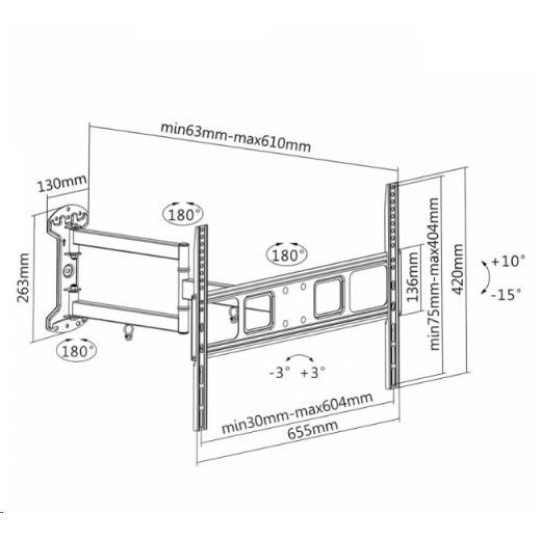 Technické údaje: maximálna zaťažiteľnosť 35kg podpora VESA štandardu 75x75 až 600x400 otáčanie do strán +90° až -90° náklon +10° až -15° nastaviteľná vzdialenosť od steny minimálna vzdialenosť od steny 63mm maximálna vzdialenosť od steny 610mm korekcia roviny +3° až -3° kvalitná konštrukcia snadná montáž a nastaviteľnosť úchytky na káble farba čierna záruka 5 rokov Držiak Fiber Mounts AX798 podporuje VESA štandardy: VESA 75x75 VESA 100x100 VESA 200x100 a 100x200 VESA 200x200 VESA 300x200 a 200x300 VESA 300x300 VESA 400x200 a 200x400 VESA 400x300 a 300x400 VESA 400x400 VESA 500x300 VESA 500x400 VESA 600x400 •VESA 200x200 •VESA 300x200 •VESA 300x300 •VESA 400x200 •VESA 400x300 •VESA 400x400 •VESA 600x400