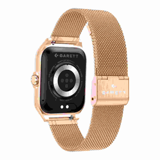 - Balenie obsahuje: chytré hodinky Garett, zlatorůžový silikonový řemínek, zlatý kovový řemínek, nabíjecí kabel USB (bez zástrčky), příručku QSG