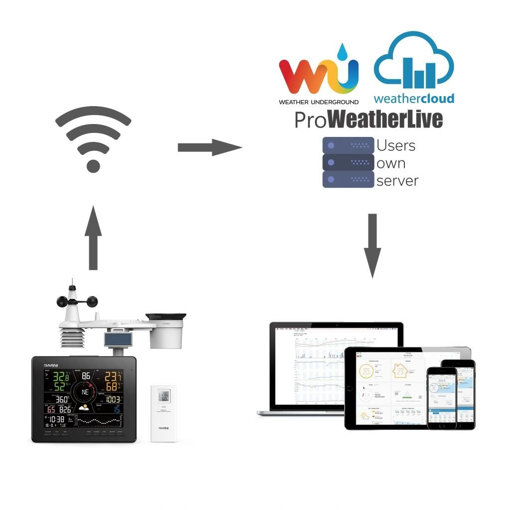 Meteorologická stanica s Wi-Fi, 24hodinovou / 7-dňovou predpoveďou a profesionálnym integrovaným bezdrôtovým senzorom 7-v-1 so solárnym panelom a vestaveným kapacitorom, model GARNI 2060 Arcus, zhromažďuje presné a podrobné údaje o počasí, ktoré sú potom v reálnom čase odosielané pomocou vestaveného Wi-Fi modulu a miestnej siete Wi-Fi na meteorologické servery a aplikácie, ako sú ProWeatherLive, Weather Underground, Weathercloud, Počasí Meteo alebo vlastný server používateľa (odporúča sa iba pre skúsených používateľov). Tieto umožňujú automatické nahrávanie dát meteorologickej stanice a voľný prístup ku všetkým údajom odkiaľkoľvek s prístupom na internet, cez webový prehliadač alebo mobilnú aplikáciu. Zároveň ProWeatherLive (PWL) server posiela 24hodinovú / 7-dňovú predpoveď počasia do hlavnej jednotky. Výrobok ponúka solidný výkon všetkým profesionálnym pozorovateľom a nadšencom vďaka širokej škále nastavení a senzorov. Meteorologická stanica vám poskytne lokálnu predpoveď, maximálne a minimálne hodnoty a celkové hodnoty všetkých meteorologických premenných, to všetko bez nutnosti použitia stolného počítača.