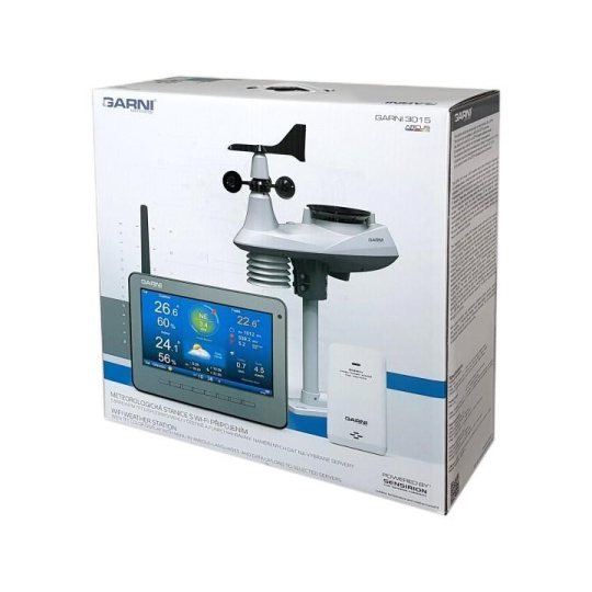 Poloprofesionálna Wi-Fi meteorologická stanica model GARNI 3015 Arcus s integrovaným bezdrôtovým snímačom 7-v-1 so solárnym panelom a vstavaným kondenzátorom a prídavným bezdrôtovým snímačom GARNI 055H, ktorá je vybavená mnohými funkciami zhromažďuje presné a podrobné údaje o počasí. Integrovaný bezdrôtový snímač pracuje na frekvencii 868 MHz a meria teplotu a relatívnu vlhkosť, rýchlosť a smer vetra, zrážky, barometrický tlak, UV index a intenzitu slnečného žiarenia. Výrobok využíva vysoko presné švajčiarske senzory SENSIRION a umožňuje kalibráciu niektorých meteorologických veličín.