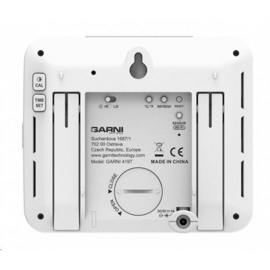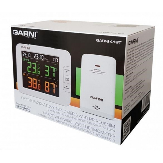 Chytrý viackanálový teplomer s vlhkomerom, model GARNI 419T má vstavaný modul WiFi a prostredníctvom svojho chytrého systému je kompatibilný s platformou Tuya IOT. Pomocou aplikácie Tuya Smart môžete sledovať teplotu a relatívnu vlhkosť hlavnej jednotky a bezdrôtových čidiel, kontrolovať históriu záznamov, nastavovať alarmy pre dané veličiny, spúšťať pokročilé funkcie za pomocou nameraných hodnôt a nameraná dáta odoslať na email v Excel súbore. Je možné ho prepojiť s ďalšími produktmi chytrej domácnosti, ovládanie potom prebieha cez aplikáciu v mobilnom zariadení. Hlavná jednotka aj bezdrôtové čidlo sú osadené švajčiarskymi čidlami SENSIRION. TUYA spolupracuje s platformou pre chytrú domácnosť Tuya pripojenie k miestnej Wi-Fi sieti 2,4 GHz spolupracuje s aplikáciou Tuya Smart jazykové mutácie aplikácie - čeština, slovenčina, angličtina farebný inverzný LCD displej o rozmeroch 90 x 81 mm stále osvetlený displej, 2 stupne jasu, nastavenie kontrastu v 15 úrovniach veľkosť číslic na displeji – čas 9 mm, dátum, skratka názvu dňa 7,5 mm, teplota 21,5 mm, relatívna vlhkosť 21 mm farby na displeji – čas, dátum, skratka názvu dňa biela, vnútorná teplota a rel. vlhkosť oranžová, vonkajšia teplota a rel. vlhkosť zelená meranie vnútornej a vonkajšej teploty a relatívnej vlhkosti zobrazenie teploty vo °C, alebo °F švajčiarska čidla SENSIRION možnosť použiť až 7 bezdrôtových čidiel (GARNI 055H, bazénové čidlo GARNI 057P) indikácia vnútornej tepelnej pohody 3 ikonami možnosť kalibrácie teploty a rel. vlhkosti vo vnútri i na jednotlivých kanáloch bezdrôtový prenos hodnôt vonkajšej teploty a relatívnej vlhkosti na frekvencii 868 MHz ikona sily signálu z bezdrôtových čidiel ikona pripojenia k miestnej Wi-Fi sieti pamäť na maximálne a minimálne namerané denno a celkové hodnoty teploty a relatívnej vlhkosti šípka vývoja teploty a rel. vlhkosti čas a dátum riadené z internetu s možnosťou manuálneho nastavenia budík s možnosťou opakovania bdenia (Snooze) po 5 minútach budicí signál - 4 sekundy 1 pípnutie za sekundu, 4 sekundy 2 pípnutia za sekundu, 4 sekundy 3 pípnutia za sekundu a potom stále 4 pípnutia za sekundu ikona slabých batérií možnosť aktualizácie firmware farba hlavnej jednotky biela napájanie sieťovým adaptérom a záložnou batériou možnosť postavenia a zavesenia Bezdrôtové čidlo GARNI 055H odolné voči vlhkosti meranie teploty a relatívnej vlhkosti švajčiarske čidla SENSIRION 7 kanálov možnosť postavenia a zavesenia farba biela možnosť postavenia a zavesenia napájanie batériami 2 ks typ AA (tužkové, nie sú súčasťou balenia) Obsah balenia hlavná jednotka 1 ks bezdrôtového čidla GARNI 055H síťový adaptér návod CZ, SK, EN, DE, PL, HU, NL
