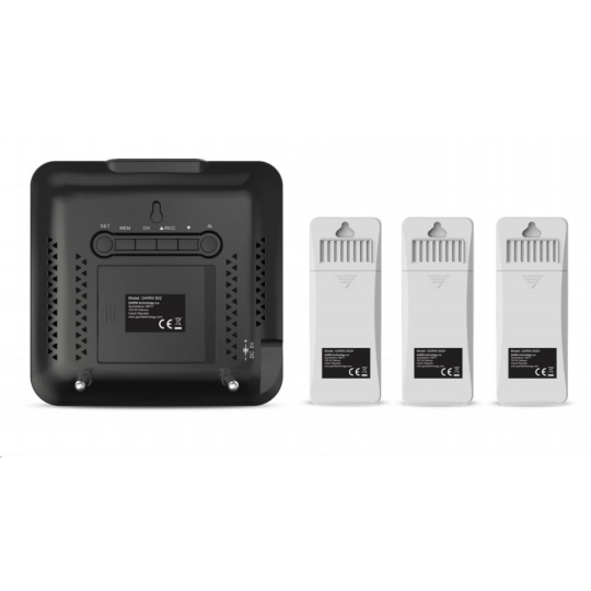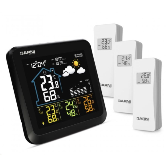 Meteorologická stanica s 3 bezdrôtovými snímačmi na meranie vonkajšej teploty a relatívnej vlhkosti, špičkovým inverzným farebným VA displejom s časom a dátumom riadeným rádiovým signálom DCF-77, budíkom, grafom, meraním vnútornej teploty, relatívnej vlhkosti a absolútneho a relatívneho barometrického tlaku. Zobrazenie všetkých meraných hodnôt na displeji súčasne. špičkový inverzný farebný VA displej o rozmeroch 106 x 94 mm s možnosťou stályho osvetlenia pri napájaní sieťovým adaptér, alebo krátkodobým osvetlením na 10 s pri napájaní batériami tri stupne jasu osvetlenia displeja (pri napájaní sieťovým adaptér) a možnosť vypnutia osvetlenia displeja veľkosť číslic na displeji – čas, dátum 7 mm, vnútorná teplota 21 mm, vnútorná relatívna vlhkosť 14 mm, vonkajšia teplota 12,5 mm, vonkajšia relatívna vlhkosť 10 mm, barometrický tlak 4,5 mm farbenie na displeji: čas, barometrický tlak, vnútorná teplota a rel. vlhkosť, graf biela, teplota a rel. vlhkosť na kanáli č.1 žltá, na kanáli č.2 zelená a na kanáli č.3 oranžová čas a dátum riadené signálom DCF-77 s možnosťou manuálneho nastavenia ikona príjmu signálu DCF-77 12-hodinový alebo 24-hodinový formát zobrazenia času možnosť nastavenia časového pásma od -12 do +12 hodín budík s funkciou opakovaného budenia (Snooze) po 5 minútach budící signál - 10 sekúnd 1 pípnutie za sekundu, 10 sekúnd 2 pípnutia za sekundu, 10 sekúnd 4 pípnutia za sekundu a následne stály pípajúci zvuk 5 ikon predpovede počasia (jasno, polojasno, oblačno, zrážky (dážď), zrážky (sneženie) na základe sledovania barometrického tlaku vestaveným barometrom možnosť nastavenia východiskovej ikony predpovede počasia zobrazenie hodnôt vnútorného a vonkajšieho tepla a relatívnej vlhkosti zo všetkých 3 snímačov súčasne zobrazenie teploty vo °C alebo °F zobrazenie barometrického tlaku absolutného a relatívneho (hPa/mb alebo mmHg) možnosť nastavenia hodnoty relatívneho barometrického tlaku graf vývoja bar. tlaku, vnútorné a vonkajšie teploty na všetkých troch kanáloch za uplynulých 12 hodín pamäť na maximálne a minimálne namerané hodnoty teploty a relatívnej vlhkosti 3 ikony vnútorného tepelného pohodlia 3 bezdrôtové snímače GARNI 052H sú súčasťou balenia bezdrôtový prenos hodnôt vonkajšej teploty a relatívnej vlhkosti na frekvencii 433 MHz ikona slabých batérií hlavnej jednotky a vonkajších snímačov napájanie hlavnej jednotky sieťovým adaptérom alebo batériami dĺžka kábla sieťového adaptéra 1,80 m možnosť postaviť, alebo zavesiť farba čierna Bezdrôtové snímač GARNI 052H odolné voči vlhkosti displej o rozmeroch 25 x 12 mm veľkosť číslic na displeji: teplota 7 mm a relatívna vlhkosť 6 mm meranie teploty a relatívnej vlhkosti 3 kanály maximálny RF výkon 10 dBm (10 mW) možnosť postaviť, alebo zavesiť farba biela Obsah balenia: 1 x hlavná jednotka GARNI 502 3 x bezdrôtové snímače GARNI 052H 1 x sieťový adaptér český, slovenský, nemecký, anglický, poľský, maďarský a holandský návod