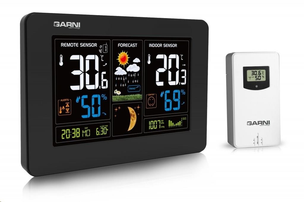 Meteorologická stanica so špičkovým inverzným farebným VA displejom s časovo riadeným rádiovým signálom DCF-77, budíkom, meraním vnútornej teploty, relatívnej vlhkosti a absolútneho barometrického tlaku, bezdrôtovým čidlom na meranie vonkajšej teploty a relatívnej vlhkosti a USB portom na nabíjanie externých zariadení inverzný farebný VA displej o rozmeroch 167 x 93 mm s možnosťou trvalého osvetlenia pri napájaní sieťovým adaptérom alebo krátkodobým osvetlením na 15 s pri napájaní batériami 4 stupne jasu osvetlenia displeja, možnosť vypnutia osvetlenia displeja s možnosťou krátkodobého osvetlenia na 15 s (pri napájaní sieťovým adaptérom) veľkosť číslic na displeji – čas, dátum, barometrický tlak 8 mm, skratka názvu dňa 6 mm, vnútorná a vonkajšia teplota 30 mm, vnútorná a vonkajšia relatívna vlhkosť 20 mm čas a dátum riadené signálom DCF-77 s možnosťou manuálneho nastavenia ikona príjmu signálu DCF-77 skratka názvu dňa 12-hodinový alebo 24-hodinový formát zobrazenia času možnosť nastavenia časového pásma od -12 do +12 hodín budík s funkciou opakovaného budenia (Snooze) po 5 minútach budící signál - 10 sekúnd 1 pípnutie za sekundu, 10 sekúnd 2 pípnutia za sekundu, 10 sekúnd 4 pípnutia za sekundu a potom stále 8 pípnutí za sekundu 6 animovaných ikon predpovede počasia (slnečno, polooblačno, oblačno, zrážky, silný dážď a sneženie) na základe sledovania barometrického tlaku vestaveným barometrom zobrazenie hodnôt vnútorná a vonkajšia teplota a relatívna vlhkosť pamäť na maximálne a minimálne namerané hodnoty teploty a rel. vlhkosti s automatickým vymazaním o 0:00 meranie absolútneho barometrického tlaku (mb / hPa alebo inHg) šipky tendencie vývoja absolútneho barometrického tlaku, vnútorná a vonkajšia teplota a relatívna vlhkosť možnosť nastavenia alarmu horného a dolného okraja vonkajšej teploty v rozsahu od -20°C do +60°C (akustický signál a ikona na displeji) pre každý kanál zvlášť s indikáciou námrazy v rozsahu od -1°C do +3°C zobrazenie teploty vo °C alebo °F možnosť použitia až 3 bezdrôtových čidl GARNI 30H (jedno čidlo GARNI 030H je súčasťou balenia) funkcia automatického prepínania kanálov 5 ikôn vnútorného tepelnú pohodu bezdrôtový prenos hodnôt vonkajšej teploty a relatívnej vlhkosti na frekvencii 433 MHz ikona príjmu signálu bezdrôtového čidla zobrazenie fázy Mesiaca USB port na nabíjanie mobilných zariadení (len pri napájaní hlavnej jednotky sieťovým adaptérom), maximálny nabíjací prúd 1000 mA ikony slabých batérií napájanie sieťovým adaptérom alebo batériami možnosť postavenia alebo zavešenia farba čierna Bezdrôtové čidlo GARNI 030H odolné voči vlhkosti displej o rozmeroch 19 x 11 mm veľkosť číslic na displeji: teplota a relatívna vlhkosť 4 mm meranie teploty a relatívnej vlhkosti 3 kanály maximálny RF výkon 10 dBm (10 mW) možnosť postavenia a zavešenia farba biela Obsah balenia: 1 x hlavná jednotka GARNI 545 Line 1 x bezdrôtové čidlo GARNI 030H 1 x sieťový adaptér český, slovenský, nemecký, anglický, taliansky, poľský a maďarský návod