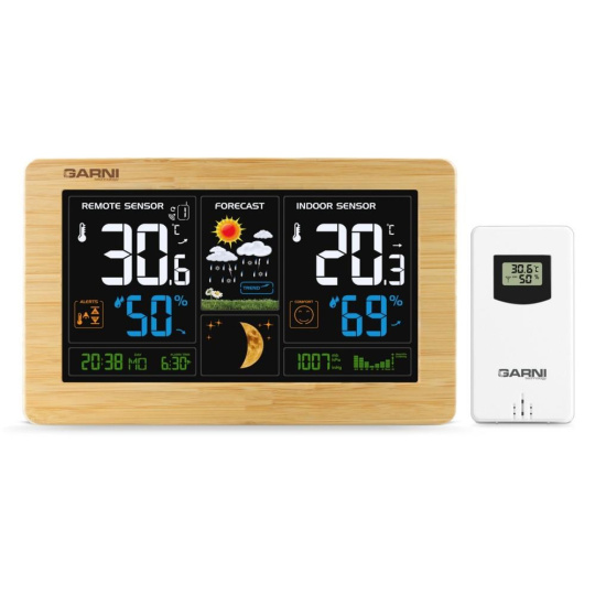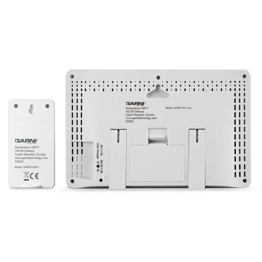 ? inverzný farebný VA displej o rozmeroch 167 x 93 mm s možnosťou stályho osvetlenia pri napájaní sieťovým adaptérom, alebo krátkodobým osvetlením na 15 s pri napájaní batériami ? ? veľkosť číslic na displeji – čas, dátum, barometrický tlak 8 mm, skratka názvu dňa 6 mm, vnútorná a vonkajšia teplota 30 mm, vnútorná a vonkajšia relatívna vlhkosť 20 mm ? čas a dátum riadené signálom DCF-77 s možnosťou manuálneho nastavenia ? ikona príjmu signálu DCF-77 ? skratka názvu dňa ? 12-hodinový alebo 24-hodinový formát zobrazenia času ? možnosť nastavenia časového pásma od -12 do +12 hodín ? ? budíkový signál - 10 sekúnd 1 pípnutie za sekundu, 10 sekúnd 2 pípnutia za sekundu, 10 sekúnd 4 pípnutia za sekundu a potom stále 8 pípnutí za sekundu ? 6 animovaných ikon predpovede počasia (slnečno, polojasno, oblačno, zrážky, silný dážď a sneženie) na základe sledovania barometrického tlaku zabudovaným barometrickým čidlom ? ? ? meranie absolútneho barometrického tlaku (mb / hPa alebo inHg) ? šipky tendencie vývoja absolútneho barometrického tlaku, vnútorná a vonkajšia teplota a rel. vlhkosť ? ? zobrazenie teploty vo C alebo F ? možnosť použitia až 3 bezdrôtových čidiel GARNI 30H (jedno čidlo GARNI 030H je súčasťou dodávky) ? funkcia automatického prepínania kanálov ? 5 ikon vnútorného tepelného pohody ? bezdrôtový prenos hodnôt vonkajšej teploty a relatívnej vlhkosti na frekvencii 433 MHz ? ikona príjmu signálu bezdrôtového čidla ? zobrazenie fázy Mesiaca ? USB port pre nabíjanie mobilných zariadení (len pri napájaní hlavnej jednotky sieťovým adaptérom), maximálny nabíjací prúd 1 000 mA ? ikony slabých batérií ? napájanie sieťovým adaptérom alebo batériami ? možnosť postavenia alebo zavesenia ? farba biela, predný rámeček z bambusového dreva Bezdrôtové čidlo GARNI 030H ? vlhkosti odolné ? displej o rozmeroch 19 x 11 mm ? veľkosť číslic na displeji: teplota a relatívna vlhkosť 4 mm ? meranie teploty a relatívnej vlhkosti ? 3 kanály ? maximálny RF výkon 10 dBm (10 mW) ? možnosť postavenia a zavesenia ? farba biela Obsah balenia: 1 x hlavná jednotka GARNI 547 Line 1 x bezdrôtové čidlo GARNI 030H 1 x sieťový adaptér český, slovenský, nemecký, anglický, holandský, poľský a maďarský návod