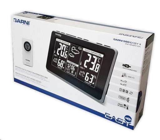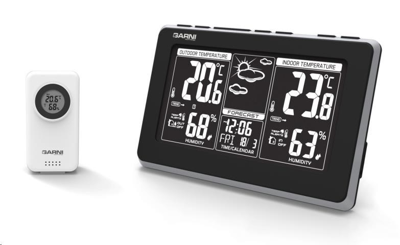 Meteorologická stanica s inverzným LCD displejom s časovo riadeným rádiovým signálom DCF-77, budíkom, meraním vnútornej teploty a relatívnej vlhkosti, bezdrôtovým čidlom na meranie vonkajšej teploty a relatívnej vlhkosti a USB portom na napájanie externých zariadení. Mobilný telefón a USB kábel nie sú súčasťou balenia - inverzný LCD displej o rozmeroch 169 x 94 mm s možnosťou stályho osvetlenia pri napájaní sieťovým adaptérom, alebo krátkodobým osvetlením na 8 s pri napájaní batériami - dva stupne jasu osvetlenia displeja, možnosť vypnutia osvetlenia displeja (pri napájaní sieťovým adaptérom) - pri napájaní len batériami možno rozsvietiť displej zvukom, napr. klepnutím, tlesknutím a pod. - veľkosť číslic na displeji – čas 12,5 mm, dátum a skratka názvu dňa 8 mm, vnútorná a vonkajšia teplota 38 mm, vnútorná a vonkajšia relatívna vlhkosť 23 mm - čas riadený signálom DCF-77 s možnosťou manuálneho nastavenia - ikona príjmu signálu DCF-77 - 12-hodinový alebo 24-hodinový formát zobrazenia času - možnosť nastavenia časového pásma od -12 do +12 hodín - budík s 2 budícími časmi s funkciou opakovaného budenia (Snooze) nastaviteľného od 3 do 20 minút - budící signál - 10 sekúnd 1 pípnutie za sekundu, 10 sekúnd 2 pípnutia za sekundu a následne stály 4 pípnutia za sekundu - 13 ikon predpovede počasia v 6 úrovniach (jasno, polojasno, oblačno, dážď, búrky a sneženie) na základe sledovania barometrického tlaku vestaveným barometrickým čidlo - zobrazenie hodnôt vnútorné a vonkajšej teploty a relatívnej vlhkosti - šípky tendencie vývoja vnútornej a vonkajšej teploty - možnosť nastavenia alarmu horná a spodná hranica vnútorné a vonkajšej teploty (akustickým signálom a ikonou na displeji) - zobrazenie teploty vo °C alebo °F - možnosť použitia až 3 bezdrôtových čidiel GARNI 040H (jedno je súčasťou balenia) - funkcia automatického prepínania kanálov - bezdrôtový prenos hodnôt vonkajšej teploty a relatívnej vlhkosti na frekvencii 433 MHz - ikona príjmu signálu bezdrôtového čidla - USB port na nabíjanie mobilných zariadení (len pri napájaní hlavnej jednotky sieťovým adaptérom), maximálny nabíjací prúd 1 000 mA - napájanie sieťovým adaptérom alebo batériami - možnosť postavenia alebo zavešenia - farba čierna s striebornou Bezdrôtové čidlo GARNI 040H - odolné voči vlhkosti, krytie IP44 (odolné proti strekajúcej vode) - kruhový displej o priemere 19 mm - veľkosť číslic na displeji: teplota a relatívna vlhkosť 5 mm - meranie teploty a relatívnej vlhkosti - 3 kanály - maximálny RF výkon 10 dBm (10 mW) - možnosť postavenia a zavešenia - farba biela Obsah balenia: 1 x hlavná jednotka GARNI 560 EASY II 1 x bezdrôtové čidlo GARNI 040H 1 x sieťový adaptér český, slovenský, nemecký, anglický, poľský a maďarský návod