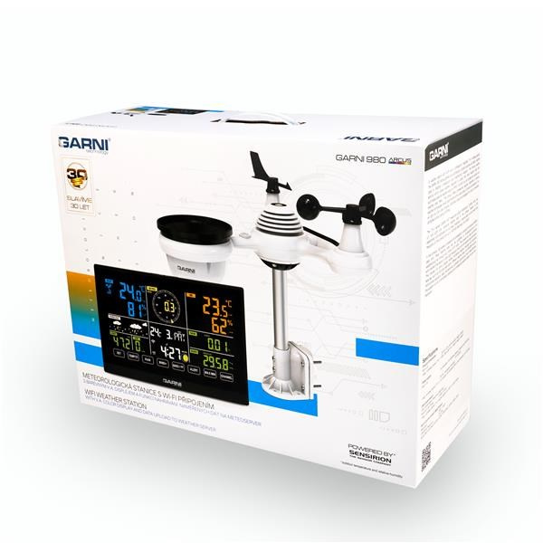 WI-FI meteorologická stanica model GARNI 980 Arcus s integrovaným bezdrôtovým čidlom 7-v-1, je vybavená mnohými funkciami zhromažďuje presné a podrobné údaje o počasí. Integrované bezdrôtové čidlo pracuje na frekvencii 868 MHz a meria vonkajšiu teplotu, relatívnu vlhkosť, rýchlosť a smer vetra, úhrn zrážok, UV žiarenie a intenzitu slnečného žiarenia. Výrobok využíva vysoko presné švajčiarské čidlá SENSIRION a umožňuje kalibráciu niektorých meteorologických veličín.