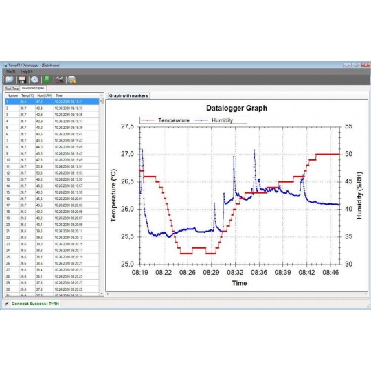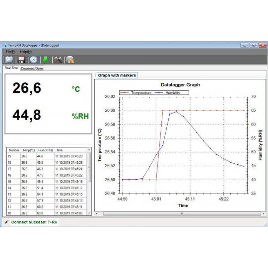 pamäť pre 20 010 hodnôt teploty a vlhkosti LCD displej o rozmeroch 22 x 20 mm pre zobrazenie aktuálnych, minimálnych a maximálnych nameraných hodnôt možnosť nastavenia načítania dát od 2 sekúnd do 24 hodín (2 až 30 s, ďalej 1, 5, 15, 30 min, ďalej 1, 5,12, 24 hodín) pripojenie k počítaču cez USB port nastaviteľný alarm horná a dolná hranica pre teplotu a relatívnu vlhkosť program TempRH Datalogger pre zobrazenie nameraných hodnôt pre OS Windows až do verzie Windows 10 (32 bit a 64 bit) zobrazenie nameraných dát v reálnom čase v priloženom programe vrátane grafu možnosť odloženého začatia merania dáta vo forme správy v pdf formáte a tabuľky vo formáte *.csv a vo formáte *.imtr (Meter Files - možné otvoriť priloženým programom) súčasťou balenia je datalogger, pútko, batéria, CD s programom a návod