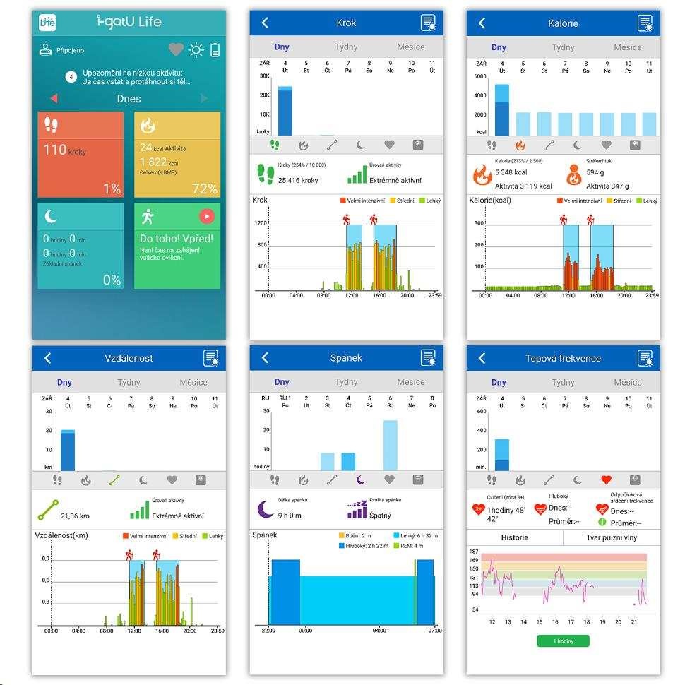 - na hlavnej obrazovke aplikácie je zobrazený prehľad nameraných hodnôt, ako je počet krokov, spálené kalórie, doba spánku, športový režim a aktuálna tepová frekvencia (ak je meranie aktivované). Možnosť merania tepovej frekvencie celý deň aj v spánku. Kliknutím na jednotlivé položky zobrazíte podrobný graf (okrem merania tepovej frekvencie)