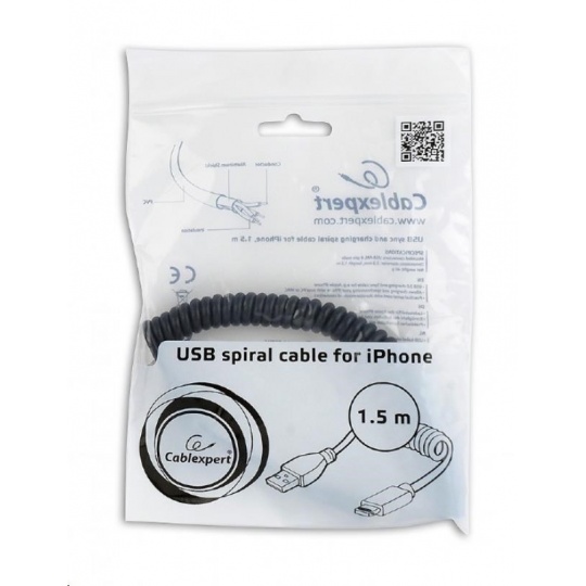 Synchronizačný a nabíjací špirálový kábel USB pre iPhone, 1.5 m, čierna