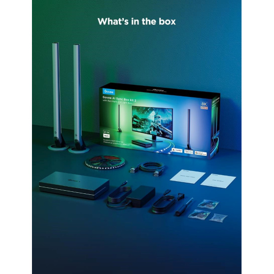 Govee AI Sync Box Kit 2 premení váš domov na centrum dokonalého audiovizuálneho zážitku vďaka pokročilej technológii poháňanej umelou inteligenciou. Navrhnutý tak, aby sa k nemu mohli pripojiť až 4 zariadenia ako PC konzola a iné zdroje HDMI signálu a kompatibilný s monitory o uhlopriečke 27-34 palcov, tento kit analyzuje HDMI signál v reálnom čase a premieta farby presne zodpovedajúce dianiu na obrazovke. Vďaka svetelným páskam RGBWIC si užijete precíznu reprodukciu farieb a dynamickú odozvu, ktoré vytvoria okolité prostredie, aby každý moment dostal život. Ako doplnenie maximálneho zážitku obsahuje systém tiež RGBICWW LED panely, ktoré okrem monitora ešte rozšíria osvetlenú plochu.