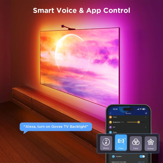 A čo viac, aplikácia Govee Home poskytuje inteligentný režim videa, ktorý zahŕňa herný režim a režim sledovania filmov. Pridajte k svojim herným dobrodružstvám dynamické osvetlenie alebo si spríjemnite svoj obľúbený film alebo seriál jemnými, relaxačnými farbami a posuňte svoj zážitok na vyššiu úroveň. Osvetlenie je kompatibilné s akýmkoľvek obsahom.
