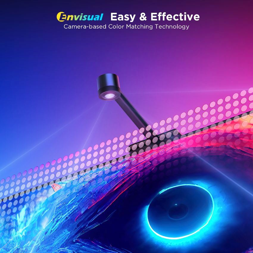 Špeciálna kamera s pokročilou technológiou Envisual inteligentne rozpoznáva a zachytáva farby na obrazovke vašej televízie alebo monitora. Na základe tejto farebnej analýzy automaticky vyhodnotí a nastaví ideálne podsvietenie. Užívajte si synchronizáciu farieb bez oneskorenia, aniž by ste potrebovali HDMI kábel alebo boli obmedzení streamovacími službami.
