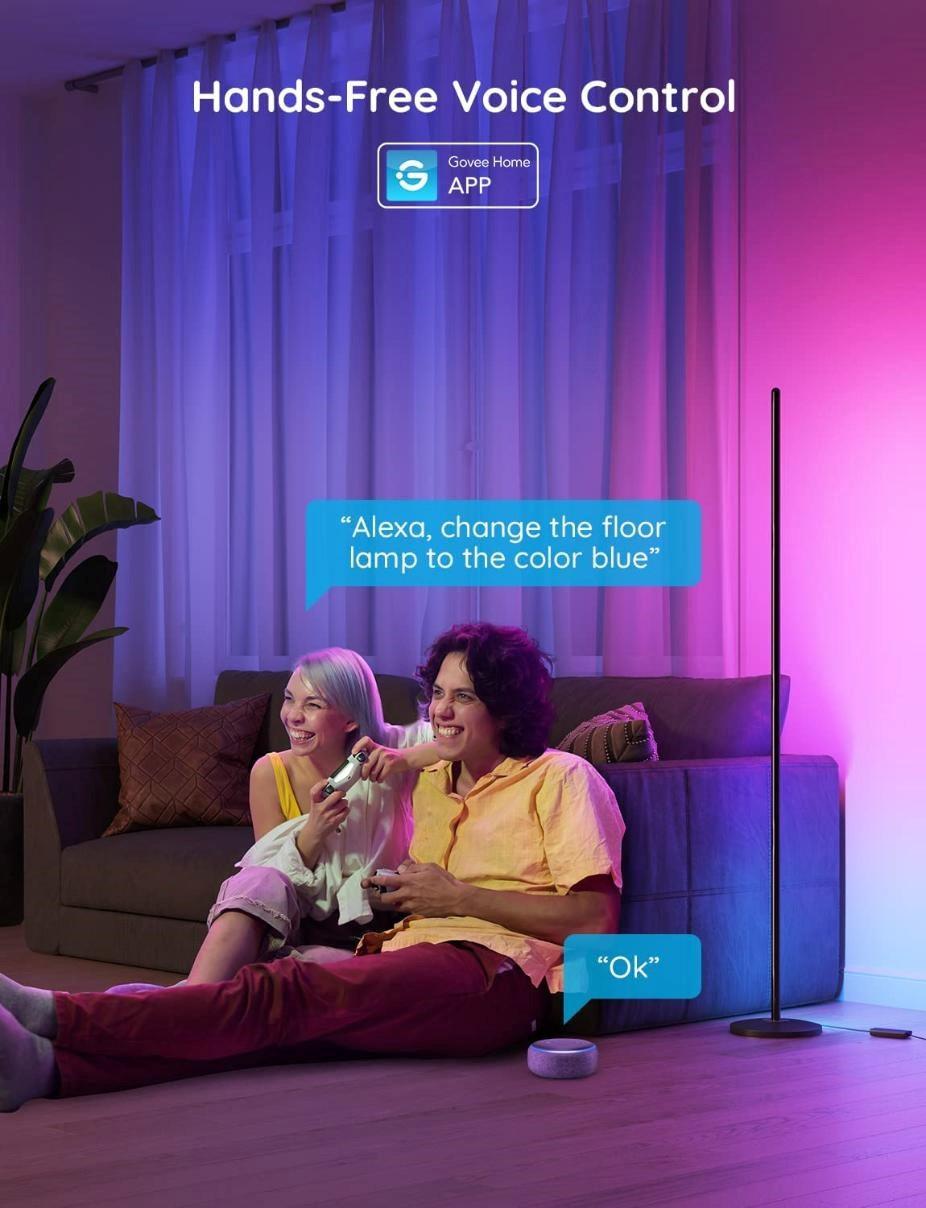 Govee Smart Corner Floor Lamp je kompatibilná s asistentmi Alexa, Google Assistant a Siri. Teraz môžete Govee Smart Corner Floor Lamp zapnúť/vypnúť, upraviť úroveň jasu alebo zmeniť ich farbu pomocou hlasových príkazov z pohodlia vašej pohovky alebo postele. Ovládanie lampy je tiež možné priamo na paneli alebo cez aplikáciu vo vašom smartfóne či tablete.