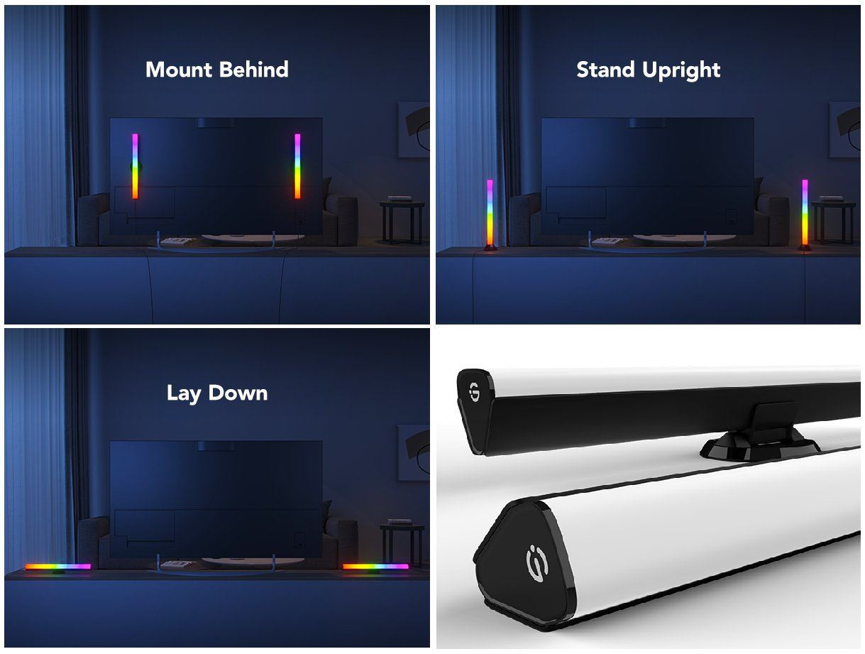 Tieto svetlá poskytujú mnoho dizajnových možností. Stojany a nástenné držiaky vám umožnia inštalovať ich vodorovne alebo zvisle na rovnom povrchu alebo pripevniť k vášmu PC/TV pomocou 3M pásky. Panel je možné rozdeliť na samostatné farebné segmenty a kombinovať ich farebné prevedenie.