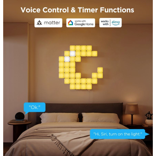 Vychutnajte si pohodlie inteligentného ovládania vďaka kompatibilite s aplikáciami Matter, Google Home, Amazon Alexa a Siri. Stačí jediný hlasový príkaz a vaše panelové svietidlá Govee Mini sa prispôsobia presne vašim potrebám – či už ide o zapnutie, zmenu farby alebo nastavenie intenzity. Vďaka funkcii časovača môžete osvetlenie jednoducho naplánovať podľa svojho denného rytmu a kedykoľvek vytvoriť dokonalú atmosféru.