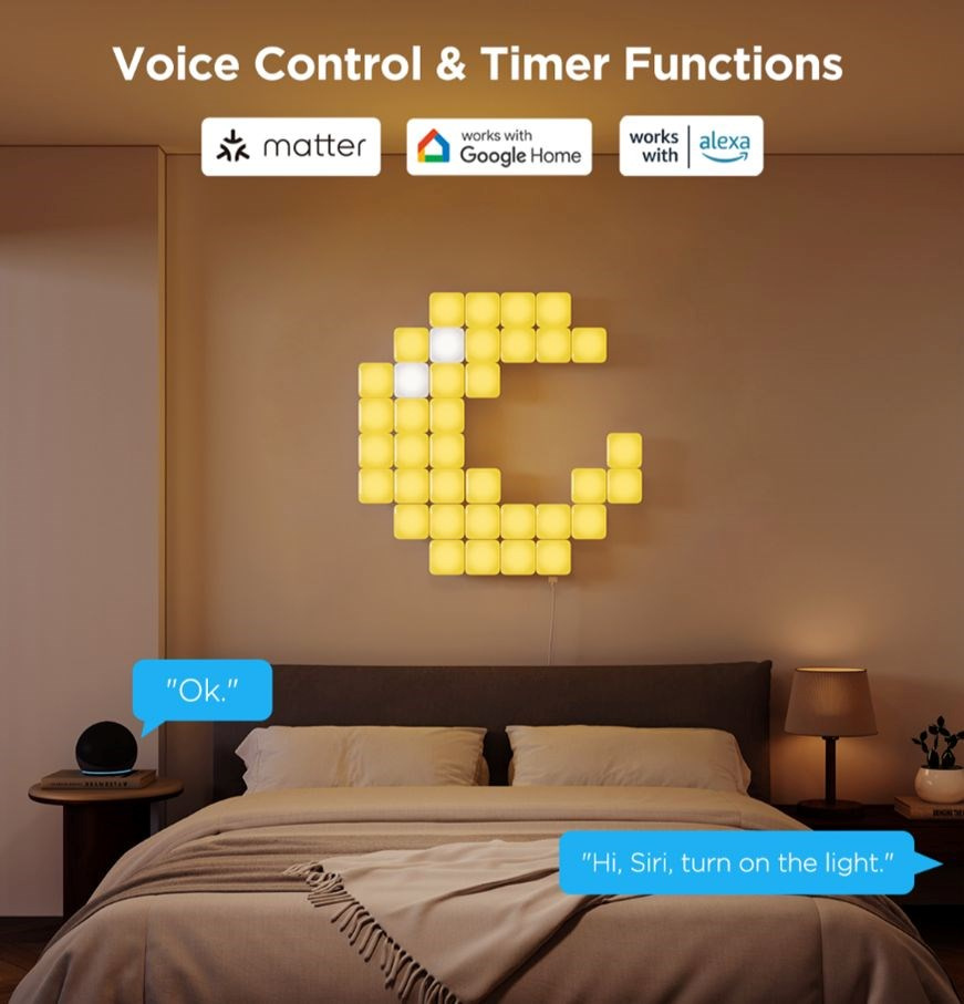 Vychutnajte si pohodlie inteligentného ovládania vďaka kompatibilite s aplikáciami Matter, Google Home, Amazon Alexa a Siri. Stačí jediný hlasový príkaz a vaše panelové svietidlá Govee Mini sa prispôsobia presne vašim potrebám – či už ide o zapnutie, zmenu farby alebo nastavenie intenzity. Vďaka funkcii časovača môžete osvetlenie jednoducho naplánovať podľa svojho denného rytmu a kedykoľvek vytvoriť dokonalú atmosféru.