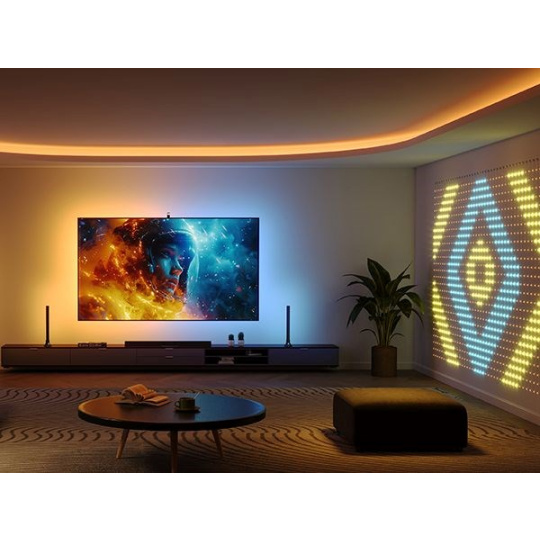 Spoločnosť Govee vám prináša sadu toho najlepšieho pre dokonalý vizuálny zážitok zo sledovania televízie. Súprava pásikov LED Backlight 3 Lite a dvoch 38 cm panelov LED predstavuje kompletné riešenie scénického osvetlenia stien za a vedľa televíznej obrazovky, ktoré vás doslova vtiahne do deja. Vďaka LED diódam RGBICW 4 v 1 v paneloch aj pásiku a hustote 30 LED diód na 1 meter pásiku dosahuje svetlo ohromujúcu intenzitu, kontrast a bohatosť farieb. S celkovou dĺžkou pásky 3,6 m je riešenie určené pre televízory s uhlopriečkou 55-65 palcov, čo je najobľúbenejšia veľkosť. Životnosť LED diód je až 50 000 hodín, takže sa nemusíte obávať, podsvietenie Backlight 3 Lite je tiež vybavené detekciou vypnutia obrazovky a automaticky vypne svetlá, keď sa prestanete pozerať, čo je pohodlné, ale hlavne energeticky úsporné. Hlavným vylepšením je však premietanie pomocou replikácie obrazu na televíznej obrazovke pomocou kamery. Tá sa veľmi jednoducho upevní nad televízor a premieta na stenu presné farby v presnom rozložení, aby poskytla čo najlepší zážitok. Vďaka technológii Govee DreamView Sync môžete navyše synchronizovať svetlo televízora až so 7 ďalšími zariadeniami Govee. Podsvietenie 3 je kompatibilné s asistentmi Google Home a Amazon Alexa a vďaka 3M lepiacim prúžkom sa nainštaluje za pár minút. Backlight 3 Lite opticky zväčší uhlopriečku vášho televízora, doprajte si skutočný zážitok z domáceho kina.