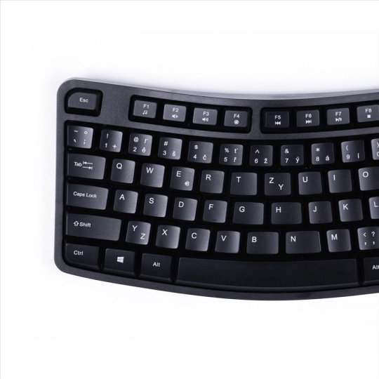 - ergonomicky tvarovaná klávesnica pre väčší komfort a správne držanie tela pri práci, predchádza bolestiam a preťaženiu ramien a šije