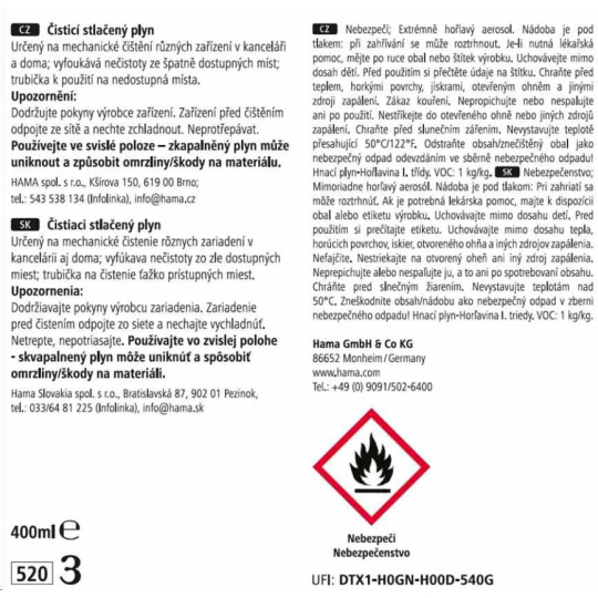 - stlačený vzduch na čistenie rôznych zariadení v kancelárii a v domácnosti - Vyfúka nečistoty z ťažko prístupných miest - Hadica na použitie v ťažko prístupných miestach - Objem: 400 ml Upozornenie pre spotrebiteľov: Pred čistením si prečítajte informácie v návode na použitie. Odpojte zariadenie od napájania a nechajte ho vychladnúť. Čistiacim vzduchom netraste a používajte ho len vo zvislej polohe, inak by mohol kvapalný plyn uniknúť a spôsobiť námrazu na zariadení alebo ho poškodiť. Prázdny obal zlikvidujte v súlade s príslušnými predpismi...